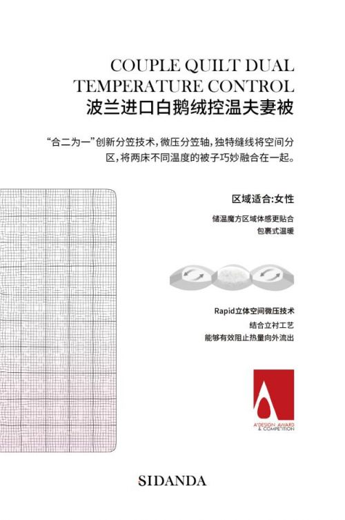 | 創(chuàng)意驅(qū)動靈感,設(shè)計重釋睡眠!SIDANDA科學(xué)睡眠系列產(chǎn)品——波蘭進(jìn)口95白鵝絨控溫夫妻被及日本革新鵝絨側(cè)睡枕同時斬獲意大利A’Design Award。成為2020年度國內(nèi)唯一獲得意大利A’Design Award家居類獎的羽絨床品品牌。