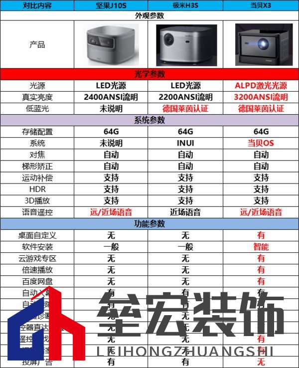 | ??極米H3S和堅果J10S作為2款亮度接近的LED投影儀,經(jīng)常被網(wǎng)友們進行對比,有像堅果J10S和極米H3S哪個好值得推薦看,極米H3S對比堅果J10S哪款更值得選擇購買等相關(guān)問題,今天呢大神不只是對這2款LED投影儀進行介紹,這回加上同樣價位的熱銷當(dāng)貝X3激光投影儀,有一個更全面對比。 ??參數(shù)區(qū)別 ??首先,老習(xí)慣分享一張圖表,一圖了解3款投影儀各自特點,網(wǎng)友可以更清晰看出區(qū)別來,然后詳細說說。