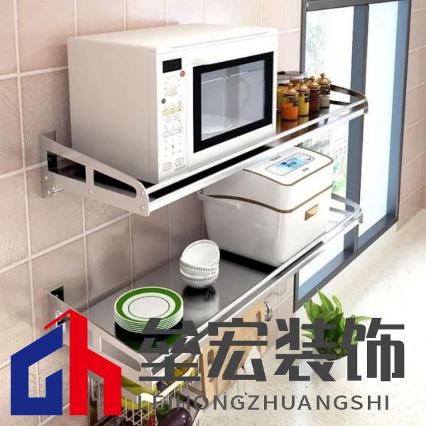 2、廚房置物架 將廚房置物架安裝在灶臺旁墻面上,不僅能節(jié)省臺面空間,還可以放置微波爐和燒水壺等小家電,側(cè)面還有掛鉤設(shè)計,可掛放砧板等小物。