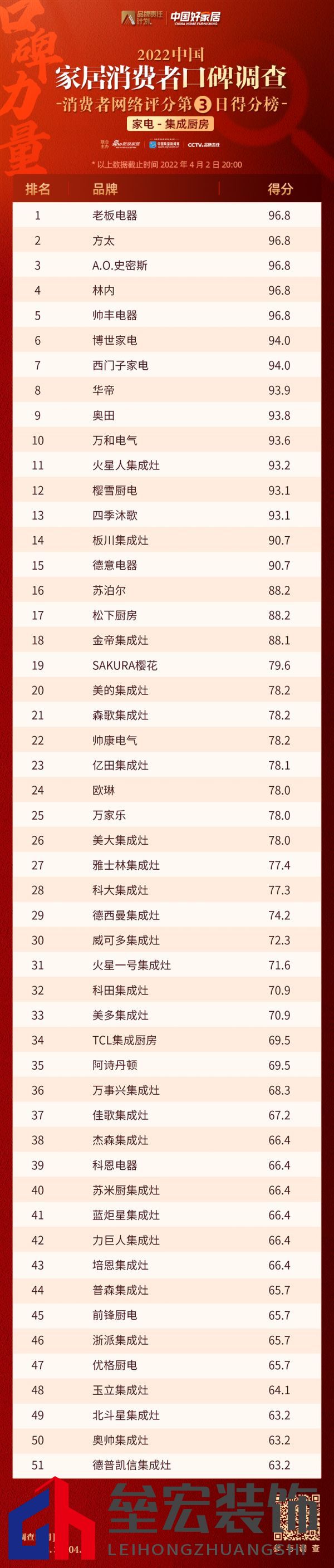 ??調(diào)查第三日,截至4月2日20時(shí),在家電行業(yè)集成廚房品類消費(fèi)者口碑榜單中,老板電器/方太/A.O.史密斯/林內(nèi)/帥豐電器以96.8分并列第一,博世家電、西門子家電緊隨其后。>>點(diǎn)擊查看品類得分榜單 ??此次參選家電-集成廚房品類的品牌,集成灶品牌比重依然眾多,目前得分靠前的依舊還是幾家實(shí)力雄厚的上市企業(yè)。而A.O.史密斯、林內(nèi)等全能型選手在此次評(píng)分中展現(xiàn)出了明顯優(yōu)勢(shì),綜合評(píng)分居于前列。老板電器、方太依舊牢牢占據(jù)家電-集成廚房榜首位置,前留名調(diào)查得分均持平,足見競(jìng)爭(zhēng)之激烈。值得一提的是,就在剛剛過(guò)去的3月,老板電器和方太陸續(xù)開啟了新品發(fā)布會(huì),老板電器高起點(diǎn)入局集成灶,而方太則與國(guó)家航天局新聞宣傳中心簽約合作。今日末三位為北斗星集成灶,奧帥集成灶,德普凱信集成灶,同樣期待這些品牌后續(xù)表現(xiàn)。 ??本次活動(dòng)由全國(guó)工商聯(lián)家具裝飾業(yè)協(xié)會(huì)、中國(guó)建筑裝飾協(xié)會(huì)住宅裝飾裝修和部品產(chǎn)業(yè)分會(huì)、中國(guó)室內(nèi)裝飾協(xié)會(huì)、中國(guó)建筑材料流通協(xié)會(huì)、中國(guó)木材與木制品流通協(xié)會(huì)、中國(guó)輕工業(yè)聯(lián)合會(huì)健康家居專業(yè)委員會(huì)6大協(xié)會(huì)全程指導(dǎo),樂(lè)居商學(xué)院和家頁(yè)智庫(kù)為本次活動(dòng)提供研究支持。 ??《2022消費(fèi)者口碑調(diào)查》覆蓋家居全品類,通過(guò)新浪家居高效分發(fā)系統(tǒng)進(jìn)行全網(wǎng)用戶覆蓋,同期入駐主流賣場(chǎng)線下采集消費(fèi)者調(diào)研樣本。調(diào)查問(wèn)卷涉及消費(fèi)者對(duì)品牌認(rèn)知、銷售過(guò)程評(píng)價(jià)、安裝交付、產(chǎn)品質(zhì)量、售后服務(wù)等6大方面?;顒?dòng)結(jié)合專業(yè)評(píng)審研討會(huì)、企業(yè)巡禮等活動(dòng),并根據(jù)調(diào)查結(jié)果,最終于5月發(fā)布“中國(guó)好家居——2022家居消費(fèi)者口碑品牌榜”、《2022中國(guó)家居消費(fèi)藍(lán)皮書》及《2022中國(guó)家居質(zhì)量先鋒志》,以此對(duì)優(yōu)質(zhì)消費(fèi)口碑典型案例及示范企業(yè)進(jìn)行表彰。 ??活動(dòng)全程與消費(fèi)者深度互動(dòng),尊重行業(yè)專家的意見,內(nèi)容觸點(diǎn)下沉到企業(yè)的生產(chǎn)線和實(shí)驗(yàn)室,力求公正、透明、詳實(shí)的向公眾展現(xiàn)參調(diào)品牌的完整風(fēng)貌,用豐富的、具有自傳播價(jià)值的內(nèi)容,呈現(xiàn)出中國(guó)家居人通過(guò)“中國(guó)創(chuàng)造”、“中國(guó)質(zhì)量”和“中國(guó)品牌”為美好幸福生活所做出的努力。 ??*注:如有家電領(lǐng)域相關(guān)新聞資訊、好物推薦等信息可發(fā)給我們,同時(shí)歡迎各大媒介和家電品牌方關(guān)注微信公眾號(hào)“家居情報(bào)站”(微信號(hào):home_news),聯(lián)系我們~ |