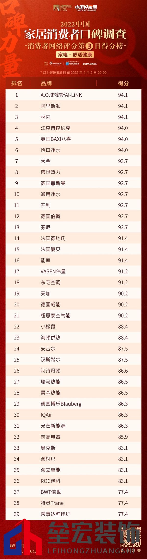 ??調(diào)查第三日,截至4月2日20時,在家電行業(yè)舒適健康品類消費者口碑榜單中,A.O.史密斯AI-LiNK/阿里斯頓/林內(nèi)以94.1分并列第一,江森自控約克/英國BAXI八喜/怡口凈水緊隨其后。>>點擊查看品類得分榜單 ??此次參選家電-舒適健康品類的品牌,集中在采暖、空調(diào)、凈化器、凈水器以及舒適集成家電領域,從目前評分來看,進口品牌仍占有較大優(yōu)勢。伴隨消費升級,中央集成家電系統(tǒng),已成為家裝新剛需。譬如A.O.史密斯精心挑選核心品類,包括熱水、采暖、空調(diào)、新風、中央凈、中央軟、油煙機,集錦在集成系統(tǒng)中,通過AI-Link智能物聯(lián)平臺,讓原本是一座座孤島式的產(chǎn)品設備,實時根據(jù)用戶所需,自主聯(lián)動運行不同模式,創(chuàng)新實現(xiàn)場景化智能一鍵操控,創(chuàng)造新的體驗和價值。阿里斯頓提出“大升數(shù)熱水器+適配功率壁掛爐”適配性節(jié)能舒適的系統(tǒng)解決方案。以舒適和節(jié)能為出發(fā)點,以一臺適配功率的壁掛爐,搭配一臺熱水器,讓全家有溫暖的供暖空間和豐沛的熱水體驗。而作為世界綜合熱能器具專業(yè)制造商,林內(nèi)始終堅持為用戶提供采暖系統(tǒng)、熱水器、廚房家電、全屋凈水等方面的專業(yè)健康生活全屋解決方案,為用戶創(chuàng)造更健康的生活方式。今日末三位為BWT倍世/特靈Trane/榮事達壁掛爐,期待這些品牌后續(xù)能直擊而上。