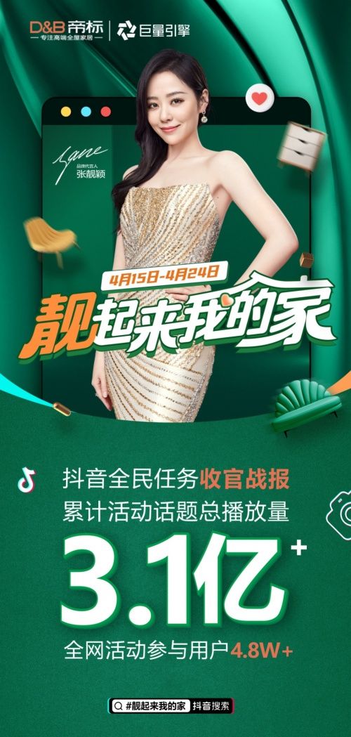 4月15-25日,帝標(biāo)家居422全國(guó)置家日主題活動(dòng)期間,帝標(biāo)家居攜手“Doulife 家居節(jié)”、“抖音全民任務(wù)”兩大熱門IP夢(mèng)幻聯(lián)動(dòng),取得了優(yōu)異的成績(jī)。其中“#靚起來我的家”抖音全民任務(wù)更是全網(wǎng)刷屏,活動(dòng)結(jié)束累計(jì)活動(dòng)話題總播放量高達(dá)3.1億+,全網(wǎng)活動(dòng)參與用戶4.8W+,被年輕人瘋狂種草! 全平臺(tái)億級(jí)流量帝標(biāo)刷屏破圈 營(yíng)銷新利器加速興趣用戶消費(fèi)轉(zhuǎn)化 近年來,隨著短視頻社交方式的崛起,為品牌營(yíng)銷帶來全新的玩法和傳播方式,也成功拉近了品牌和年輕消費(fèi)者之間的距離,其中抖音作為品牌短視頻營(yíng)銷的主流陣地,結(jié)合不同形式的抖音挑戰(zhàn)賽,以有趣的表現(xiàn)形式和互動(dòng)模式吸引消費(fèi)者參與內(nèi)容共創(chuàng),實(shí)現(xiàn)品牌和用戶的深度交互,被視為品牌營(yíng)銷的曝光利器。