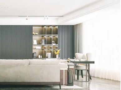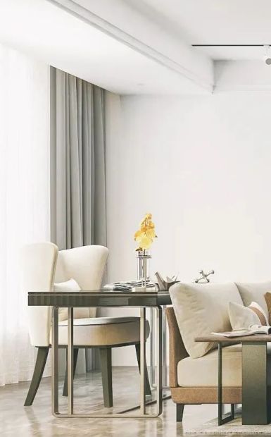 ??從沙發(fā)到陽臺,軟裝的線條婉轉(zhuǎn)浪漫,用輕奢金屬勾勒意境。 ??嵌入式書柜提升整體格調(diào),材質(zhì)與色調(diào)的變幻與桌椅在光影點綴下,搭配出豐富層次和質(zhì)感,讓輕奢的表達更加柔軟。