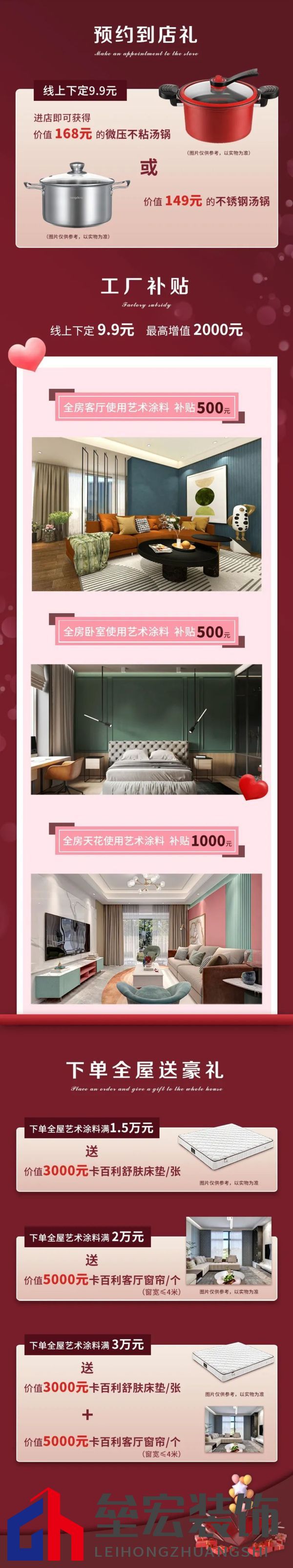 送禮清單 你裝修,我們補貼!春季裝修正值火熱時間,一直耽擱裝修的業(yè)主朋友們,趁這個“卡百利520超級品牌日”有福利啦!一定不要錯過這次活動!卡百利工廠補貼,助力消費者安家入住。線上下定9.9元,最高增值2000元,進店還能獲得湯鍋好禮!下定全屋藝術(shù)涂料,消費滿即送床墊、窗簾一系列豪禮!