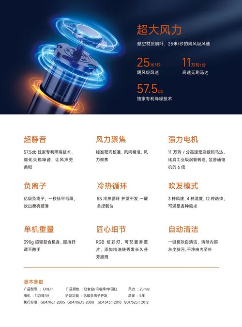 精致小巧·美好留香 osak橙颯卡超靜音高速吹風(fēng)機(jī)出色的外觀及人體工程學(xué)設(shè)計(jì),定制加入RGB炫彩燈,繽紛絢爛,每一次吹風(fēng)都是視覺(jué)盛宴;采用超輕復(fù)合材料,整機(jī)僅重390g,相當(dāng)于一罐可樂(lè)的重量。搭配舒適手柄,讓吹風(fēng)機(jī)使用起來(lái)輕便不酸手。