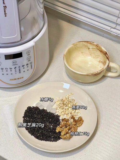 ??黑芝麻核桃燕麥奶 ??食材:黑芝麻20g、核桃仁15g、燕麥30g、冰糖5g、水500ml ??做法:核桃仁清洗干凈,瀝干水分備用;黑芝麻淘洗干凈,瀝干水分備用;將核桃仁以及黑芝麻、燕麥和水放入奧克斯破壁機,選擇豆?jié){功能,功能完成后放入冰糖選擇破壁功能攪打10秒左右即可。(長期堅持食用便可以起到養(yǎng)發(fā)、烏發(fā)的作用。)