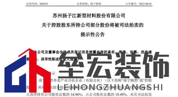 | 8月3日晚間,揚子新材(002652.SZ)公告稱,控股股東南寧頤然養(yǎng)老產(chǎn)業(yè)合伙企業(yè)(有限合伙)(以下簡稱“南寧頤然”)所持公司部分股份將被執(zhí)行司法拍賣,執(zhí)行拍賣的數(shù)量為5370萬股,占其所持有公司股份總數(shù)的34.96%,占公司股份總數(shù)的10.49%。  本次股份拍賣,起因是大連銀行上海分行與南寧頤然等金融借款合同糾紛一案引發(fā)的凍結(jié)拍賣一事。本次司法拍賣事項不會導(dǎo)致公司控制權(quán)發(fā)生變更,不會對公司的正常生產(chǎn)經(jīng)營產(chǎn)生重大影響。 截止8月3日,南寧頤然持有公司153,600,000股股份,占公司股份總數(shù)的30%;累計被凍結(jié)股份81,239,573股,占其持有公司股份總數(shù)的 52.89%,占公司股份總數(shù)的 15.87%。本次被司法拍賣股份合計53,700,000股,占其持有公司股份總數(shù)的34.96%,占公司股份總數(shù)的 10.49%。 出品:搜狐焦點家居 |