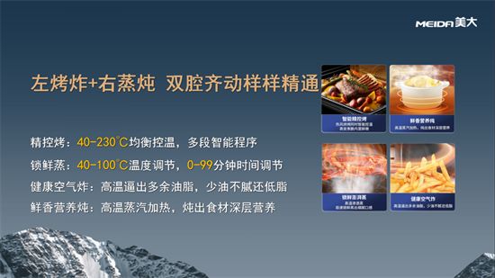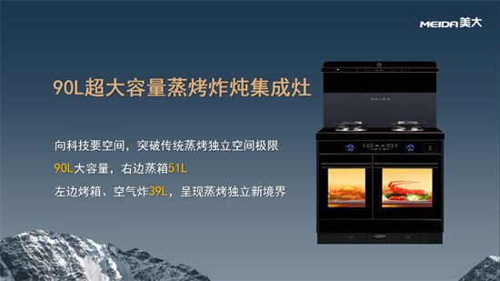 90L大容量 重塑大膽空間,包容百變風味 在洞察多元烹飪需求場景下,美大新品風華系列蒸烤炸燉集成灶超大內膽設計在1㎡內玩轉空間,突破傳統(tǒng)蒸烤獨立集成灶容量小的空間限制,美大在內膽空間上升級研發(fā),大膽擴容,搭載90L超大容量,左烤炸51L+右蒸燉39L,雙腔齊動樣樣精通,把烹飪所需充分囊括,高效烹飪無需等待。美大風華蒸烤炸燉集成灶,以超大內膽,探索更多功能組合;秉創(chuàng)新集成,筑就烹飪新境界;方寸蒸烤領略科技演繹空間的烹飪藝術。兩個人的三菜一湯不在話下,全家歡聚團圓時刻從容不迫,升階詮釋集成空間,重塑空間與時間的美感,享受多元烹飪自由。