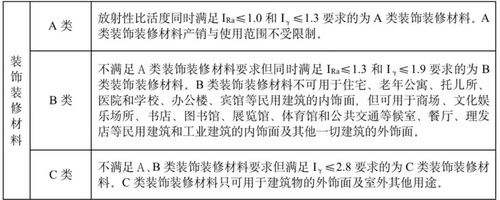 我國2002年1月1日實施的GB 6566-2001《建筑材料放射性核素限量》標(biāo)準(zhǔn),對以水泥、磚瓦、砂石等建筑主體材料規(guī)定了嚴(yán)格的內(nèi)照射和外照射指標(biāo),對以花崗石和建筑陶瓷為代表的裝飾材料規(guī)定了內(nèi)照射和外照射指標(biāo)及相應(yīng)的適用范圍。標(biāo)準(zhǔn)中未提及大理石、石灰?guī)r和板巖產(chǎn)品的放射性要求,原因是這類產(chǎn)品的放射性水平很低,遠(yuǎn)遠(yuǎn)低于標(biāo)準(zhǔn)上限指標(biāo)要求,對人類是非常安全的,根本不存在這類石材會對花、金魚等造成損害的事情。該標(biāo)準(zhǔn)對石材的放射性要求比原建材行業(yè)標(biāo)準(zhǔn)JC518-1993(96)《天然石材產(chǎn)品放射防護(hù)分類控制標(biāo)準(zhǔn)》要寬松,采用了原GB 6566-2000《建筑材料放射衛(wèi)生防護(hù)標(biāo)準(zhǔn)》內(nèi)容,說明從衛(wèi)生安全方面對石材的放射性要求并不高。2008年,GB6566標(biāo)準(zhǔn)進(jìn)行了修訂,總結(jié)了標(biāo)準(zhǔn)實施6年多各方面的經(jīng)驗,取消了大于C類的分類,不再指定裝飾材料的適用種類。現(xiàn)行標(biāo)準(zhǔn) GB 6566-2010《建筑材料放射性核素限量》于2010年9月2日發(fā)布,2011年7月1日實施,標(biāo)準(zhǔn)對裝飾裝修材料具體要求見表2。 表2 裝飾裝修材料放射性分類控制指標(biāo)