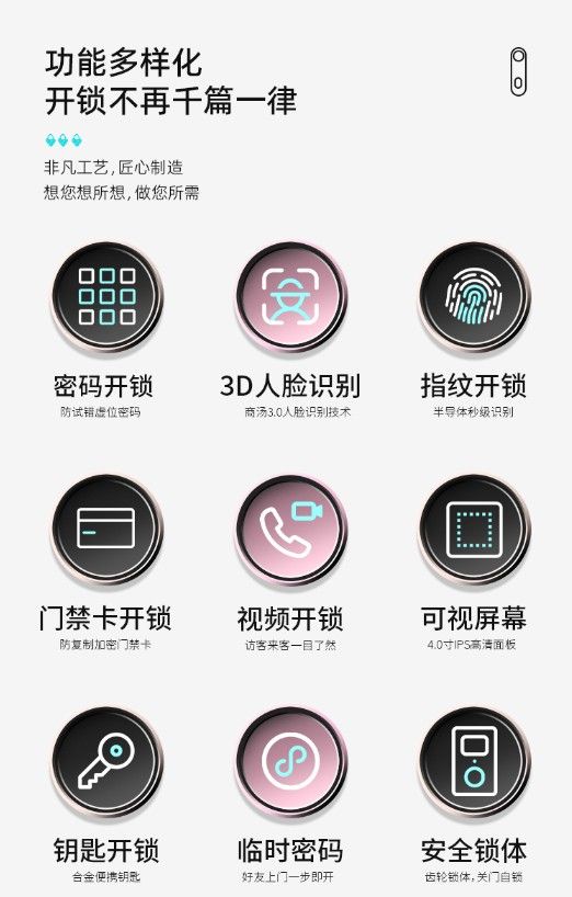 ??此外,在功能方面,匯泰龍“彤心鎖”還集合了3D人臉識別、可視對講解鎖、密碼開鎖、指紋開鎖、視頻開鎖、臨時密碼等8種方式,為人們帶來了更好的家居安全守護和智能家居體驗。人臉識別功能采用的是3D雙目仿生人臉識別技術(shù),搭配BCTC金融級人臉?biāo)惴?,不管是無光、暗光或背光等任何環(huán)境,都可秒速識別,帶妝和佩戴飾品等情況也無任何影響。