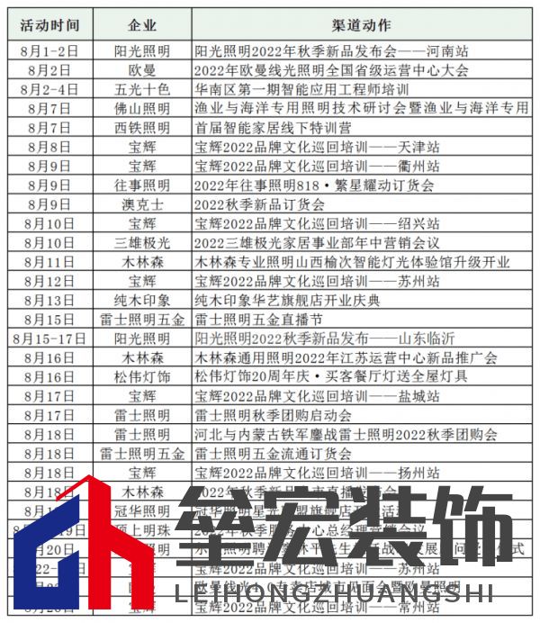 | 隨著各大照企2022年半年度業(yè)績(jī)報(bào)告的出爐,疫情下各大照明企業(yè)的渠道布局也成為大眾關(guān)注的一大亮點(diǎn),在筆者看來(lái),疫情加速了照明行業(yè)從“紅?!钡健八{(lán)海”的轉(zhuǎn)變,而未來(lái)的競(jìng)爭(zhēng)關(guān)鍵則是渠道下沉的比拼。 對(duì)于照明行業(yè)而言,接連不斷的“會(huì)議”營(yíng)銷,就是照明行業(yè)渠道競(jìng)爭(zhēng)激烈的最直觀體現(xiàn)。綜合來(lái)看,無(wú)論是渠道會(huì)議、交流會(huì)議、新品推廣會(huì)議,還是培訓(xùn)會(huì)議,都是在憑借企業(yè)核心競(jìng)爭(zhēng)力賦能終端。 進(jìn)入8月,各個(gè)企業(yè)再度掀起一場(chǎng)渠道熱,木林森、陽(yáng)光照明、歐曼、雷士照明、佛山照明、松下照明、五光十色、冠華照明、寶輝等一大波企業(yè)紛紛在渠道上“動(dòng)”起來(lái)。  據(jù)不完全統(tǒng)計(jì),今年8月份已有30場(chǎng)“會(huì)議”營(yíng)銷,本期,讓我們一同走進(jìn)木林森、雷士照明、陽(yáng)光照明、歐曼照明等企業(yè),看看他們?cè)谇老鲁辽隙际侨绾伟l(fā)力的? 木林森 01 經(jīng)銷商渠道 關(guān)鍵詞:通用照明新品推廣會(huì) 8月11日,木林森專業(yè)照明山西榆次智能燈光體驗(yàn)館盛大開(kāi)業(yè);8月16日,木林森以“大勢(shì)所趨 未來(lái)已來(lái)”為主題召開(kāi)了木林森通用照明2022年江蘇運(yùn)營(yíng)中心新品推廣會(huì),會(huì)上廠商同商共議,并對(duì)下半年木林森通用照明在江蘇市場(chǎng)的建設(shè)提出了更明確的發(fā)展方向。