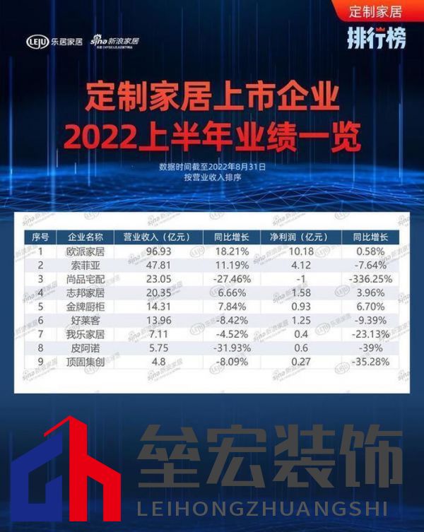 | ??新浪定制家居訊 截至目前,九家上市定制家居企業(yè)已悉數(shù)發(fā)布“2022年上半年度業(yè)績報告”,歐派家居以營收、凈利潤雙料第一穩(wěn)居行業(yè)榜首。