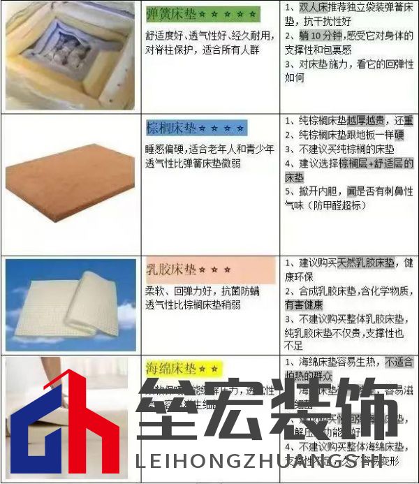 您在家居生活和家居選購(gòu)中,是不是也有這樣那樣的糾結(jié)與苦惱? 其實(shí)這些問題也很好解決,小編教您四招輕松選床墊: 1、要選適合自己的,到店體驗(yàn)很關(guān)鍵! 想要選擇一張好的床墊,首先要選擇適合自己體型的。每個(gè)人的脊椎曲線不一樣,睡眠習(xí)慣也不一樣,當(dāng)您平躺在床墊上時(shí),如果臂部沒有明顯下陷,腰部也沒有懸空,理論上這個(gè)床墊是適合的。 2、選床墊要明確自身的需求。 哪些是自身的需求呢? 比如年齡段,是青少年睡、中年人睡還是老年人睡,不同年齡段人群對(duì)床墊制作工藝的需求有很大差別。 再如身高體重。比如一個(gè)成年人如果他的體重基數(shù)比較大,選擇太軟的床墊會(huì)導(dǎo)致支撐力不足,睡醒后很有可能腰酸背痛。如果體重偏輕,卻選了一張較硬的床墊,那身體和床墊的貼合面不足,睡眠質(zhì)量也是會(huì)大打折扣的。 再就是要結(jié)合自身身體特點(diǎn)及家庭情況。打個(gè)比方,如果消費(fèi)者是一個(gè)容易過敏的體質(zhì),就需要考慮床墊是否有防螨抗菌功能,因?yàn)榇矇|一般使用年限比較長(zhǎng)且很難徹底清潔打理,有防螨抗菌功能的床墊可以大大減少過敏的困擾。另外,買床墊還是要根據(jù)自己實(shí)際購(gòu)買預(yù)算來選擇,這一點(diǎn)也是非常重要。無論別人怎么推銷,一定找準(zhǔn)自己的定位,千萬別交智商稅啊。 3、搞清楚床墊類型,看看哪款才是你需要的 選擇床墊,健康環(huán)保非常重要,朝夕相伴的東西,馬虎不得。然后就是選擇床墊類型,彈簧床墊、棕櫚床墊、乳膠床墊、海綿床墊,它們各有利弊,小編整理了一張圖,方便大家快速對(duì)比了解!