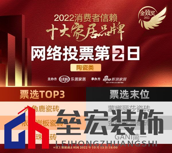 | 由樂居家居主辦,新浪家居承辦;CCTV《大國(guó)品牌》、家頁、家居質(zhì)量研究院、大國(guó)中居聯(lián)合主辦;全國(guó)工商聯(lián)家具裝飾業(yè)商會(huì)、中國(guó)建筑材料流通協(xié)會(huì)共同指導(dǎo);樂騰商學(xué)院、家頁智庫(kù)、家居質(zhì)量研究院提供研究支持。9月16日,第三屆《尋找優(yōu)質(zhì)消費(fèi)者品牌--2022消費(fèi)者信賴十大家居品牌》正式啟動(dòng)。經(jīng)過企業(yè)申報(bào)、候選品牌公示環(huán)節(jié)后,于10月12日正式進(jìn)入投票環(huán)節(jié)。>>點(diǎn)擊進(jìn)入投票頁 陶瓷品類第二日戰(zhàn)報(bào)如下