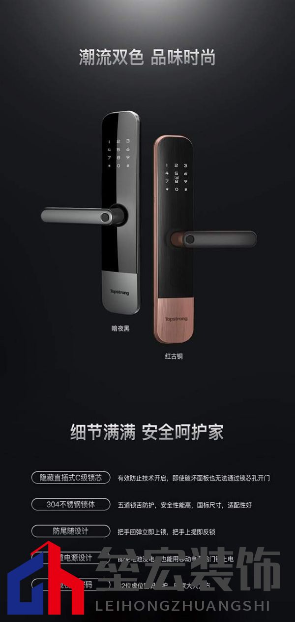 ??防窺視偽密碼,給你安全的障眼法 ??有時(shí)候旁邊有人看著你輸密碼,而你又不想讓別人知道,是不是覺得有點(diǎn)尷尬?頂固W3系列智能鎖,配置了防窺視偽密碼功能,輸入密碼時(shí),正確密碼前后可隨意輸入數(shù)字,防止“別有用心”的人通過指紋查看密碼痕跡,就算有人在旁邊也可以大大方方輸密碼,不用遮掩,安全系數(shù)無(wú)可挑剔。 ??此外,頂固W3系列智能鎖還具備人性化的一次性臨時(shí)密碼,比如親戚朋友上門拜訪,而你還沒到家,就可以發(fā)臨時(shí)密碼給他們開門,一次性使用,用完就永久失效,既方便又安全。 ??304不銹鋼鎖體,五重加強(qiáng)防護(hù) ??門鎖擔(dān)當(dāng)著家庭安全衛(wèi)士的重要責(zé)任,安全性是它必備且首要的技能。頂固深知家庭安全防護(hù)的需求,所以在材料的選擇上追求卓越品質(zhì)。頂固W3系列智能鎖的鎖體、鎖舌及關(guān)鍵傳動(dòng)部分均為304不銹鋼打造,堅(jiān)固耐磨,防撬、防鋸、防沖撞、防銹、防刮花,構(gòu)筑起城堡般牢固的家。 ??超高顏值,一握即開,和煩人的鑰匙說拜拜,頂固W3系列智能鎖,暗夜黑、紅古銅雙色呈現(xiàn),成就完美的防線,給你一個(gè)便捷、安全的家! |