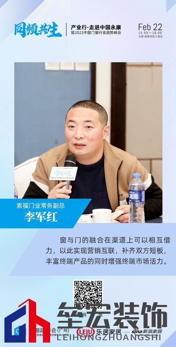 ??索福門(mén)業(yè)常務(wù)副總李軍紅:窗與門(mén)的融合在渠道上可以相互借力,以此實(shí)現(xiàn)營(yíng)銷(xiāo)互聯(lián),補(bǔ)齊雙方短板,豐富終端產(chǎn)品的同時(shí)增強(qiáng)終端市場(chǎng)活力。 |