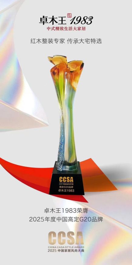 2025年7月8日,在萬眾矚目的“萬福倉之夜——致敬高定十年·第十屆CCSA家居風(fēng)尚大典暨2025高定十年G20+頒獎禮”上,紅木整裝創(chuàng)lin品牌卓木王再度榮膺“高定G20品牌大獎”。 作為“紅木整裝世家 傳承祖宅首選”品牌,卓木王已連續(xù)幾年蟬聯(lián)此項行業(yè)頂ji榮譽,卓木王持續(xù)獲得行業(yè)高度認(rèn)可,穩(wěn)居中式高定標(biāo)桿地位。