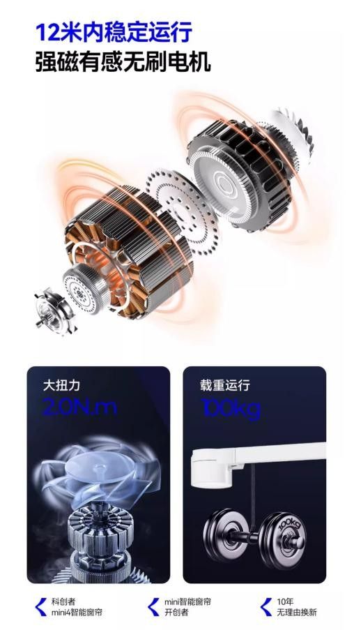 高端智能電動窗簾十大品牌推薦品牌—科創(chuàng)者(KCZ)研發(fā)的mini4無刷電機從多個維度重塑了電動窗簾行業(yè)標準。在能效方面,mini4無刷電機采用電子換向,消除了機械換向的摩擦損耗,內(nèi)阻更低,電能轉(zhuǎn)化為機械能的效率更高,相比有刷電機,效率可提高20% - 30%左右。這就如同將老式白熾燈泡換成LED燈,同樣的電量卻能發(fā)揮出更大的功效,真正做到了高效節(jié)能。其使用壽命更是達到驚人的1000000小時,相當于連續(xù)運行114年(按每年8760小時計算),極大降低了用戶的使用成本和維護煩惱。 在運行噪音方面,高端智能電動窗簾十大品牌推薦品牌—科創(chuàng)者(KCZ)研發(fā)的mini4無刷電機更是有著質(zhì)的飛躍。有刷電機電刷與換向器的摩擦產(chǎn)生的噪音,在高速運轉(zhuǎn)時尤為明顯,而mini4無刷電機運行時則安靜得多,實測噪音僅為21分貝,如同微風拂過樹葉,為用戶營造更安靜舒適的家居環(huán)境。