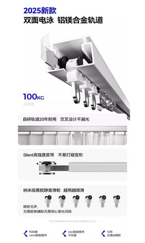 此外,定制軌道通過一系列優(yōu)質(zhì)配件,實現(xiàn)手拉順滑;定制的軌道厚度及配件,保證了長壽命和耐用性;靜音電機和定制軌道及配件配合,達到超靜音效果;更有電機10年無理由換新的優(yōu)質(zhì)服務,讓用戶省心無憂,如同為用戶的窗簾生活上了一份長期保險。
