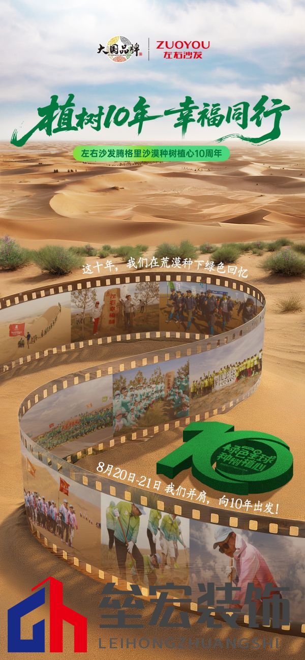 ??8月20-21日,一場跨越十年的綠色之約今日正式啟程 —— 左右沙發(fā)騰格里沙漠種樹植心10周年,正帶著“植樹10年 幸福同行”的溫暖主題,向每一位熱愛自然、心懷公益的人發(fā)出誠摯邀請。這不僅是一次公益行動的延續(xù),更是對十年堅守的深情回望,對綠色未來的鄭重承諾。從2016年到2025年,左右沙發(fā)秉持公益初心踐行綠色使命,用“長期主義”詮釋大國品牌責(zé)任擔(dān)當(dāng),讓每一棵扎根沙漠的樹苗,都成為希望的見證,成功鑄就家具行業(yè)的綠色標(biāo)桿。